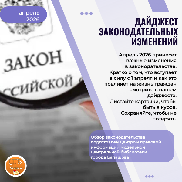 Апрель 2026 принесет важные изменения в законодательстве. Кратко о том, что вступает в силу с 1 апреля и как это повлияет на бизнес и жизнь граждан смотрите в нашем дайджесте.Листайте карточки, чтобы быть в курсе. Сохраняйте, чтобы не потерять. Больше карточек в наших группах в социальных сетях: https://ok.ru/adresbibl/topic/158279201206314 https://vk.com/wall-198940341_2034 Изменение норм законодательства Основание для изменений Ограничения переплаты по микрозаймам С 1 апреля максимальная переплата по микрозаймам сроком до одного года будет снижена с 130 до 100%. Верхнюю границу суммы микрозайма для компаний или ИП поднимут с 5 млн до 15 млн руб. Федеральный закон от 29.12.2025 N 545-ФЗ «О внесении изменений в отдельные законодательные акты Российской Федерации» В гостиницы…