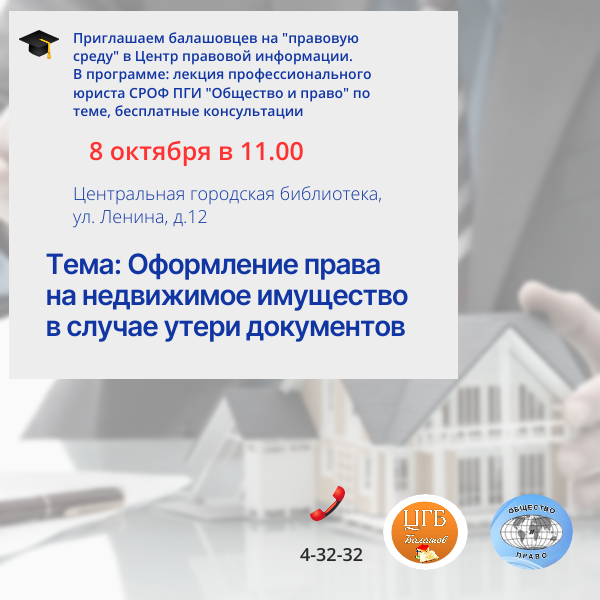 Уважаемые друзья! Приглашаем вас принять участие во встрече с юристом СРОФ ПГИ «Общество и право». Мероприятие пройдет в формате «правовой среды» и включает в себя лекцию и бесплатные консультации по теме «Оформление права на недвижимое имущество в случае утери документов».