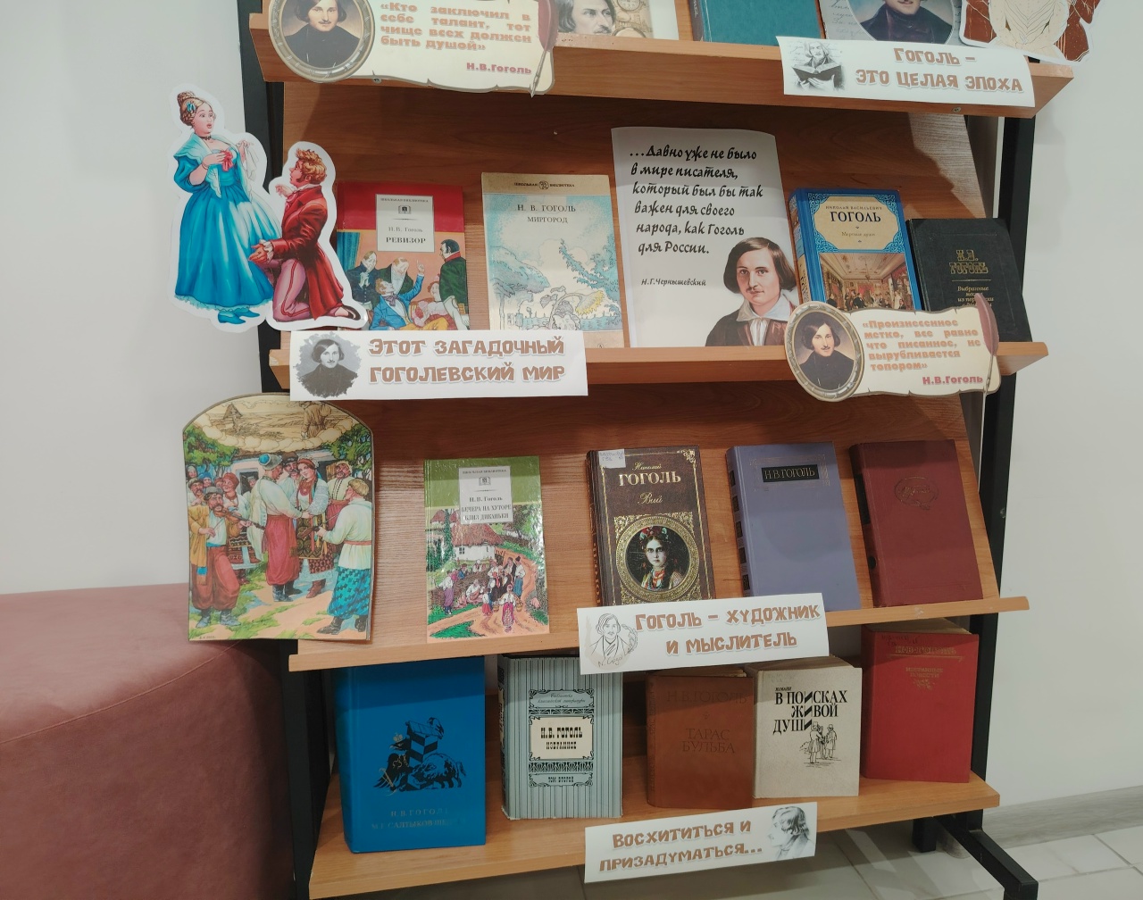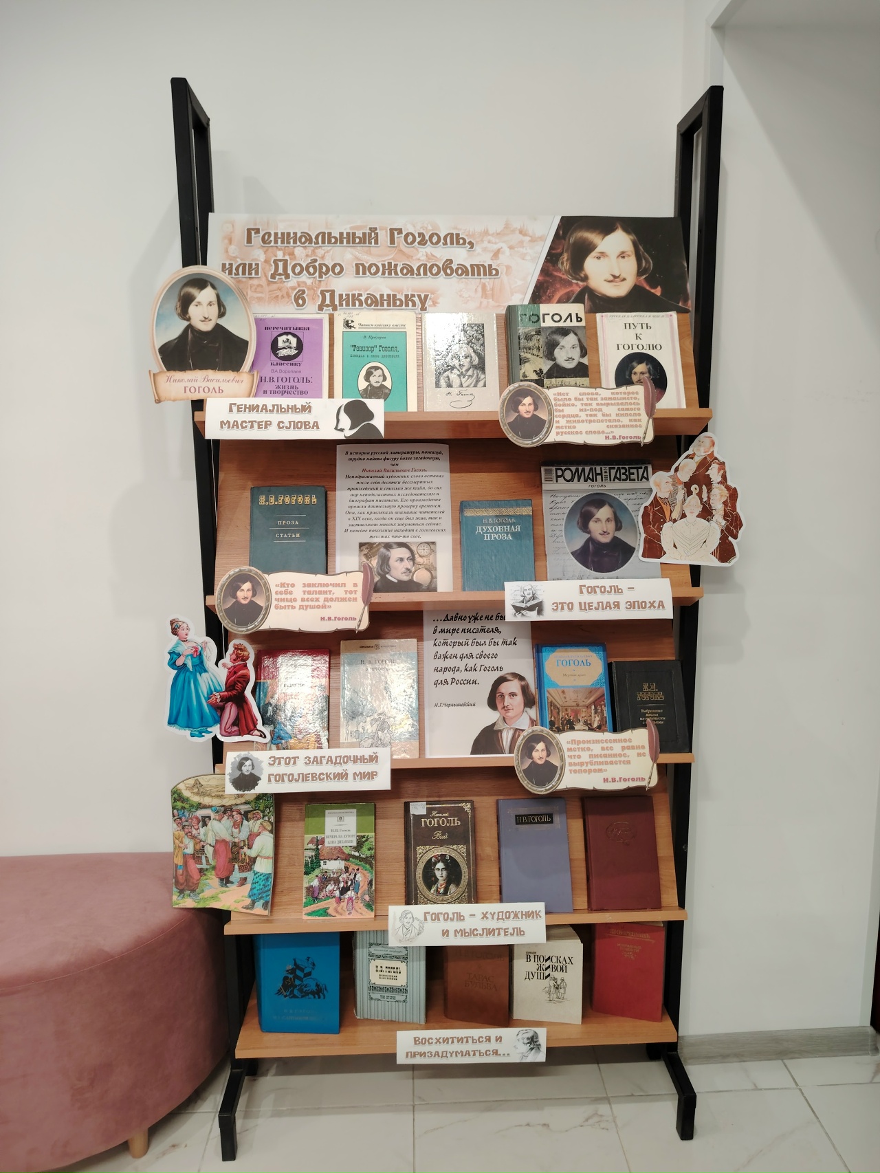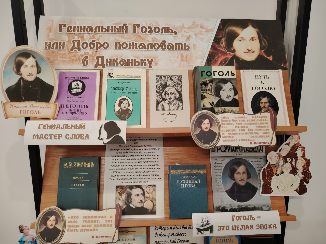В модельной центральной библиотеки оформлена книжная выставка-портрет «Гениальный Гоголь или Добро пожаловать в Диканьку». На экспозиции представлены книги о жизни и деятельности замечательного русского писателя, воспоминания самого автора и его современников, литературная критика, а также наиболее известные произведения Н.В. Гоголя: «Мертвые души», «Вечера на хуторе близ Диканьки», «Вий», «Тарас Бульба», «Миргород», «Ревизор» и многие другие.