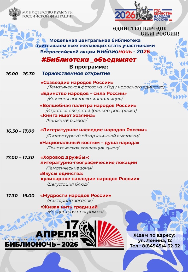 Дорогие друзья! Уважаемые читатели! Модельная центральная библиотека приглашает вас стать участниками Всероссийской акции — «Библионочь — 2026»!
