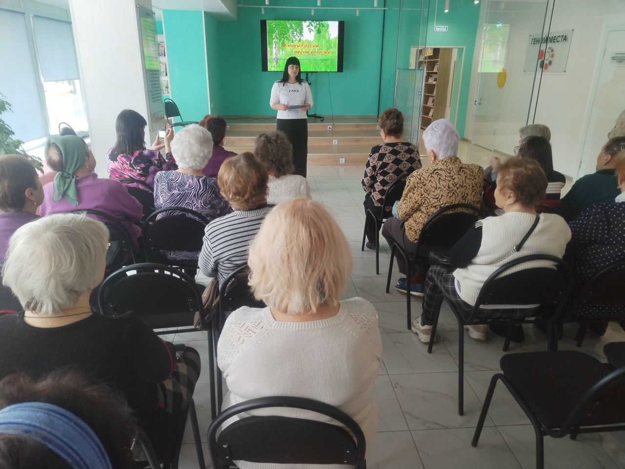 В рамках года единства народов России в модельной центральной библиотеке для членов информационного клуба «Озарение» была проведена литературно-музыкальная гостиная-экспромт «У моей России песни золотые…». Ведущая и гости мероприятия обсуждали вопросы о сохранении и продолжении такого важного для культуры страны понятия, как «русская народная песня». Русские являются государствообразующей нацией. Мы вбираем в себя фольклор и традиции разных народов, но продолжаем хранить в себе истоки истинно русско-народных мотивов. Не смотря ни на что, песня живет и побуждает людей раскрывать свои таланты, неся ее в массы. На каждом празднике, вечере, важных выступлениях, на детских утренниках обязательно звучит та или иная русская народная песня, окрыляя и принося с собой теплое, душевное настроение.
